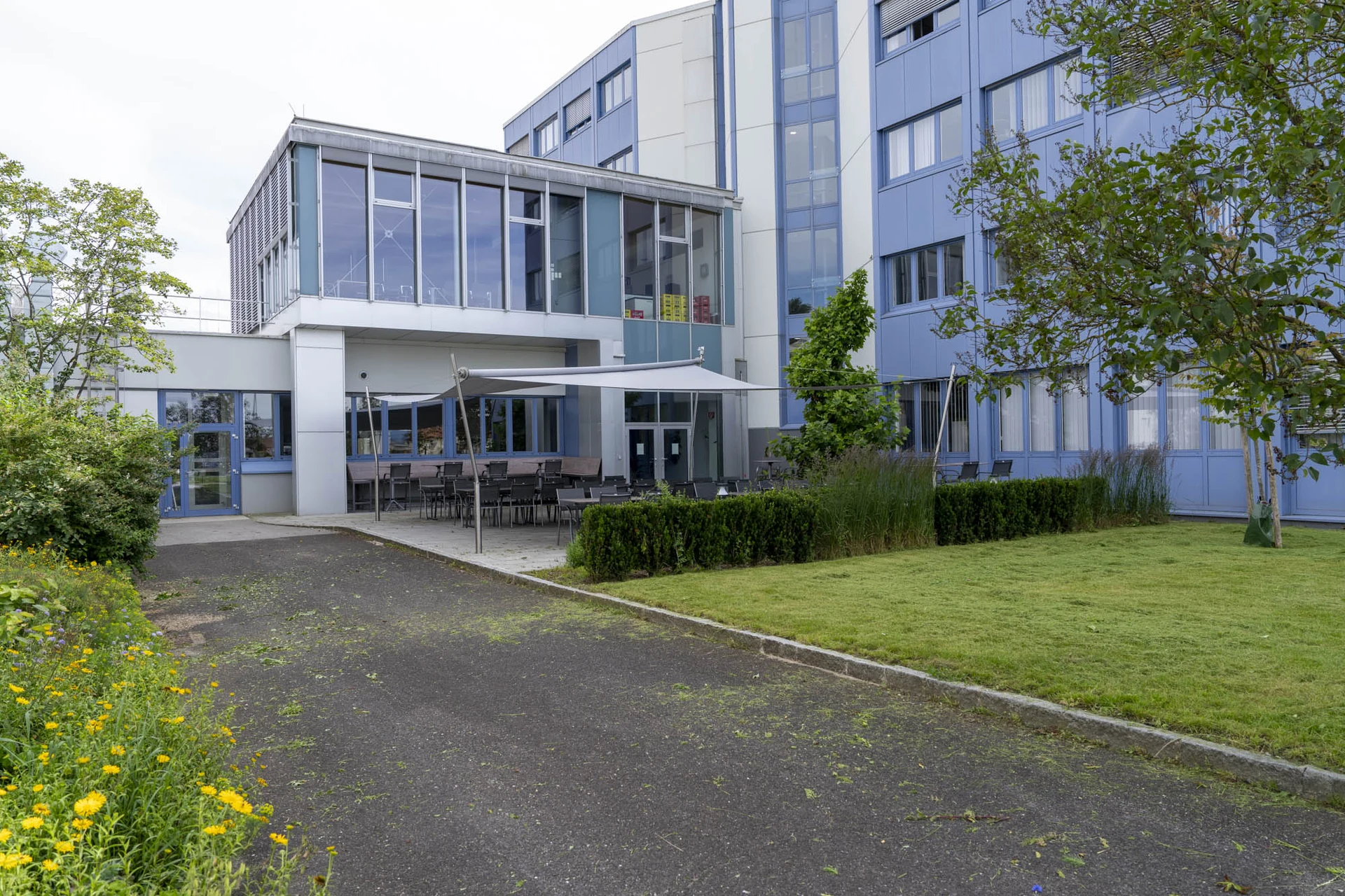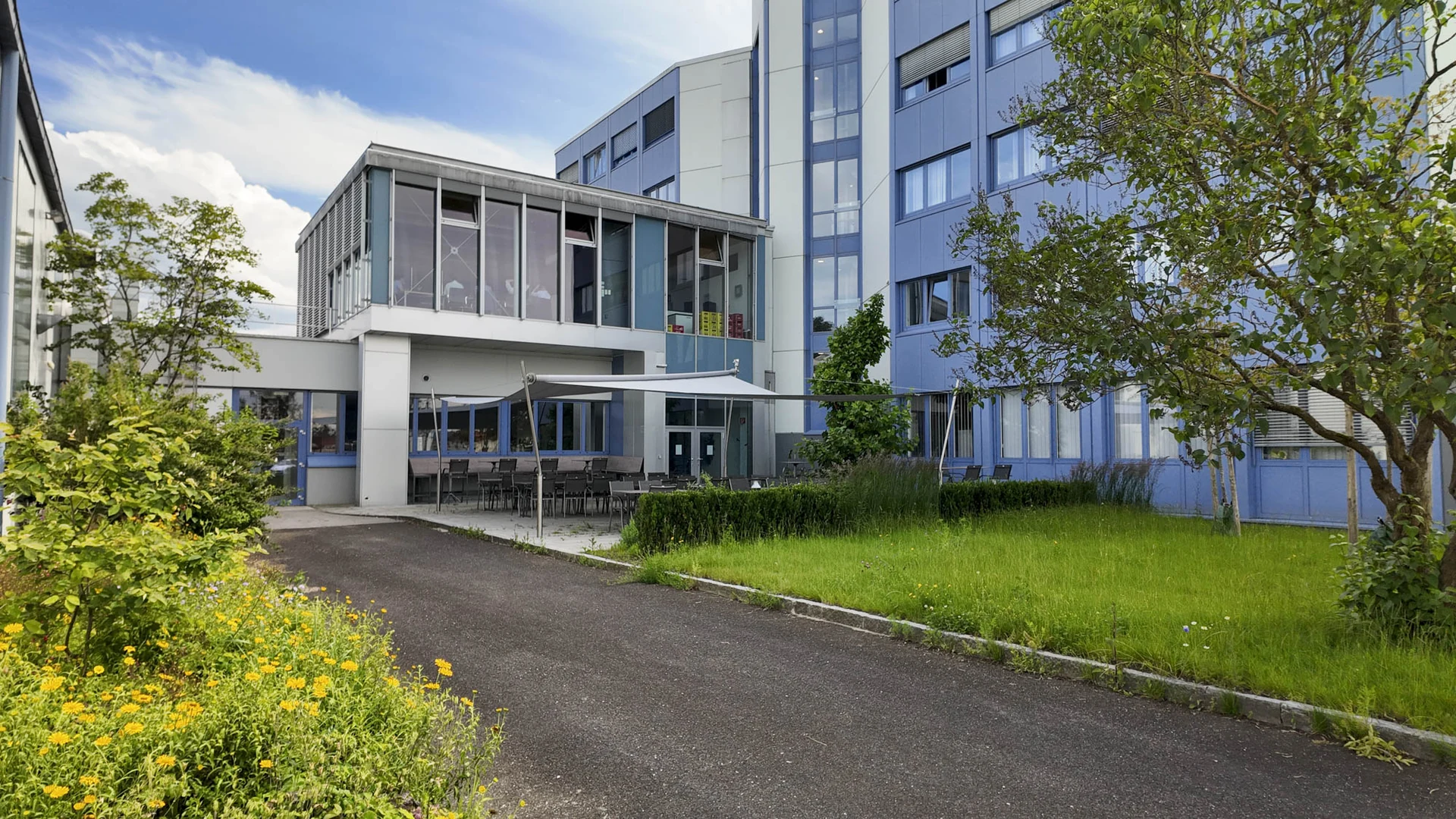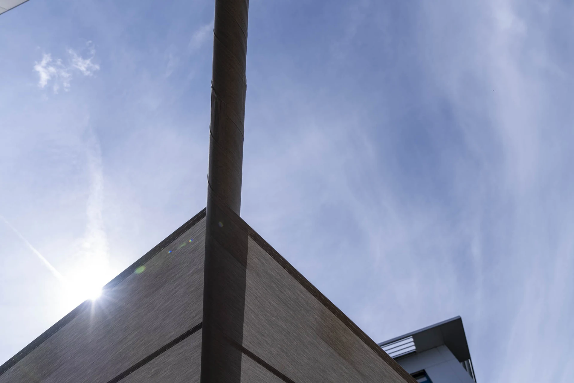 Die individuell konzipierten Sonnensegel sorgen ganztägig für angenehmen Schatten – ob für kurze Pausen oder konzentriertes Arbeiten im Freien.