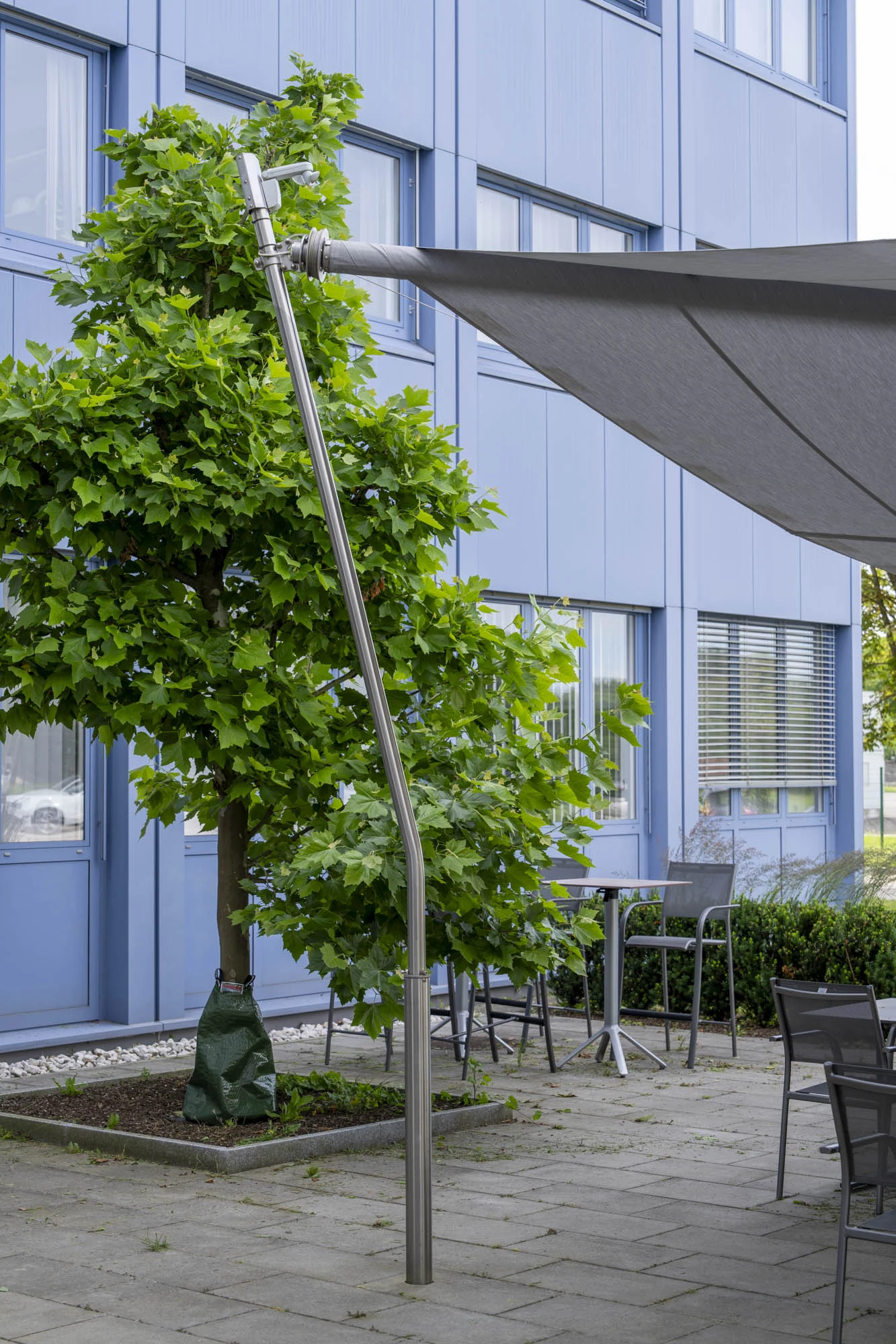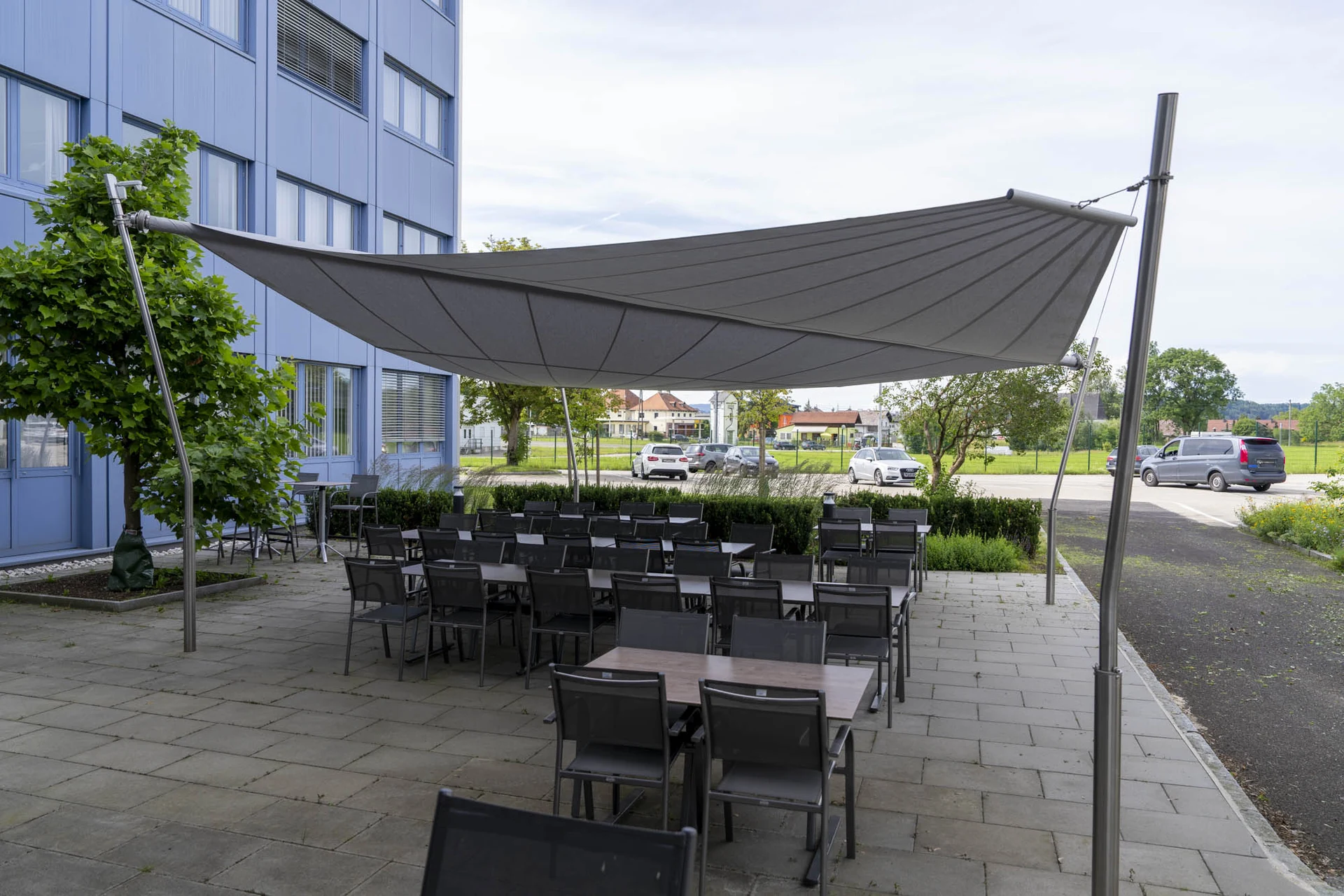 Wie auch beim Hauptstandort bei der Kantine überzeugt das System durch seine automatische Steuerung: Der integrierte Windwächter fährt das Segel bei starkem Wind selbstständig ein, was nicht nur die Langlebigkeit des Systems erhöht, sondern auch das Büro-Team entlastet. Mitarbeiter können die Fläche spontan nutzen, ohne sich um den Sonnenschutz kümmern zu müssen.