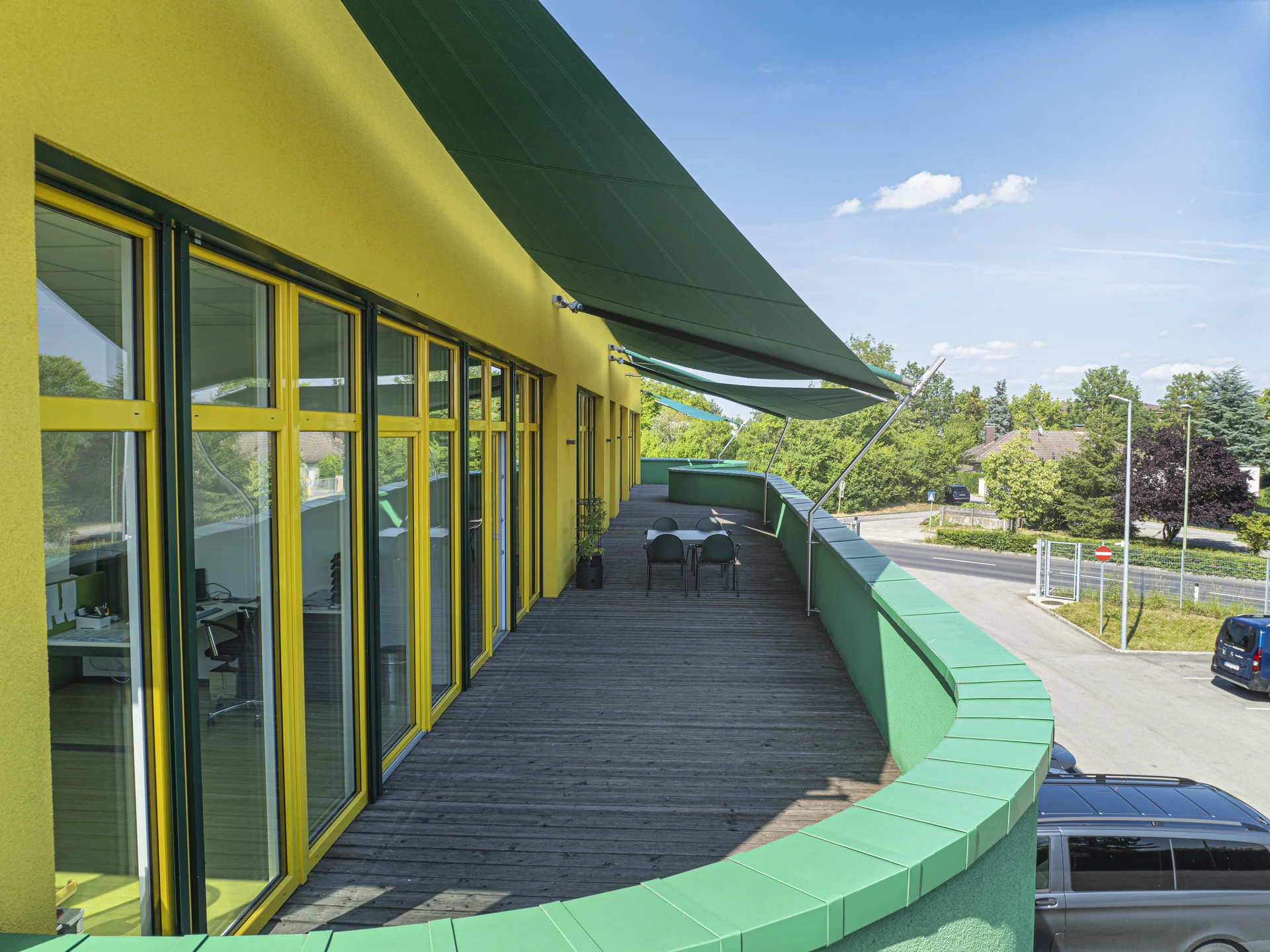 Das maßgefertigte Ganzjahres Sonnensegel bei OLIO schafft nicht nur ein angenehmes Mikroklima auf dem Balkon, sondern macht ihn ganzjährig nutzbar – als Pausen- und Kommunikationsfläche für Mitarbeitende. Die grüne Farbgebung fügt sich harmonisch in die Architektur ein und vermittelt ein modernes, nachhaltiges Unternehmensbild nach außen.