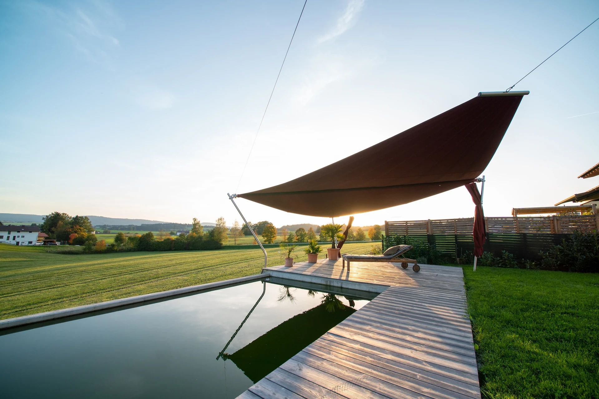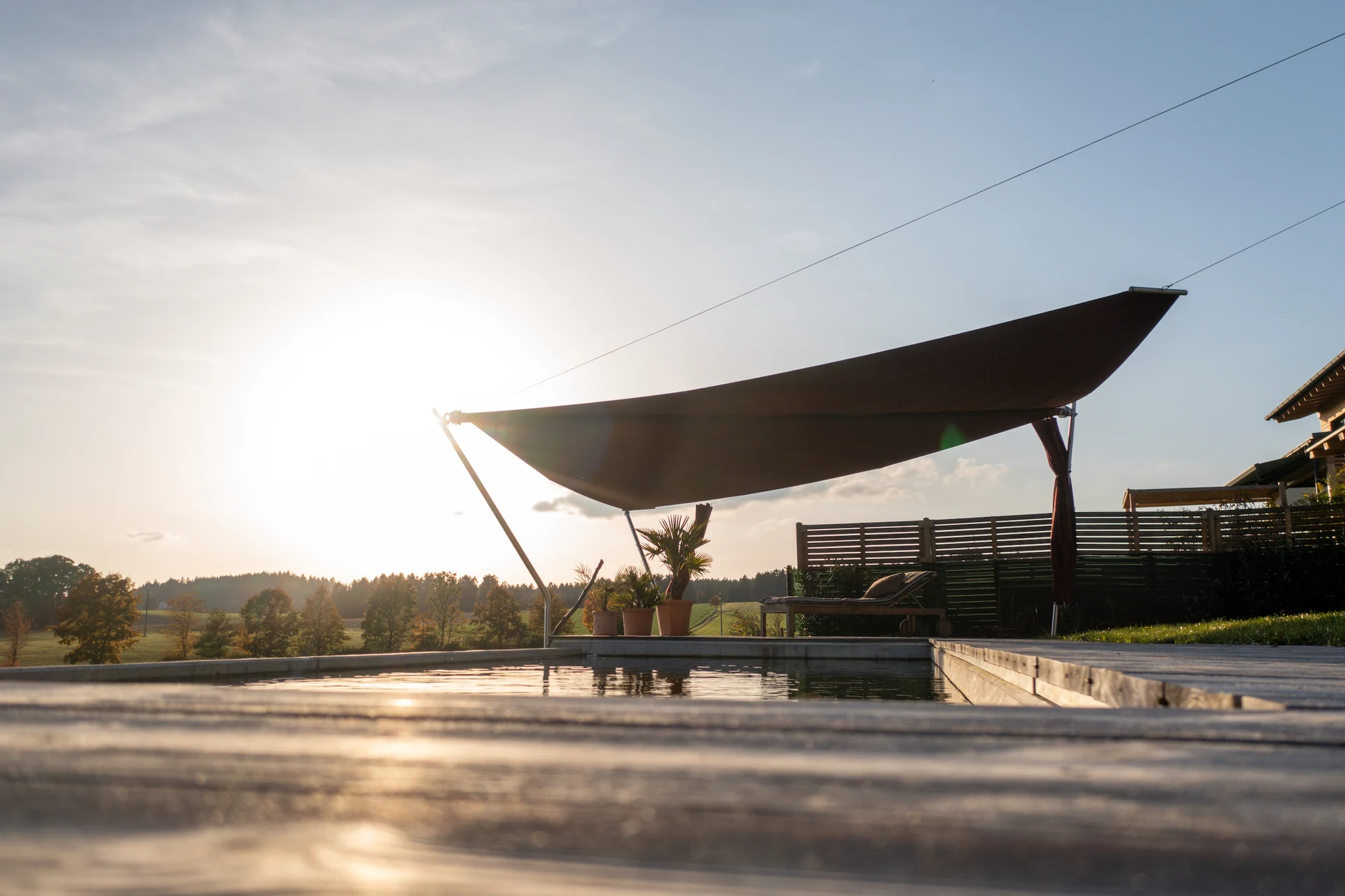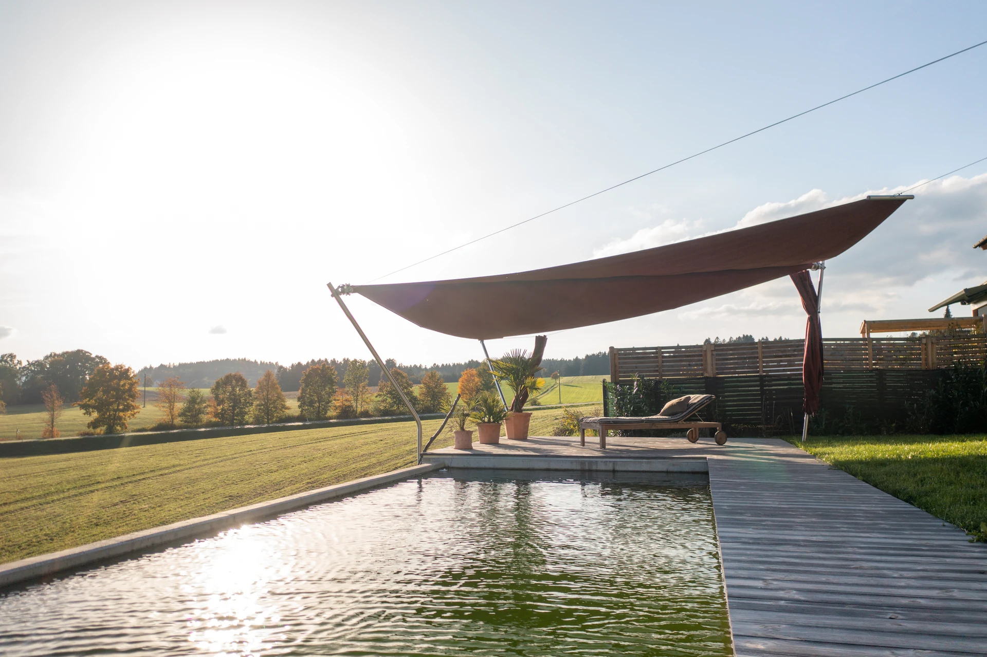 Ein Sonnensegel am Naturpool ist nicht nur funktional, sondern schafft auch einen eleganten Lebensraum im Freien – ideal für Entspannung und produktives Arbeiten bei jedem Wetter.