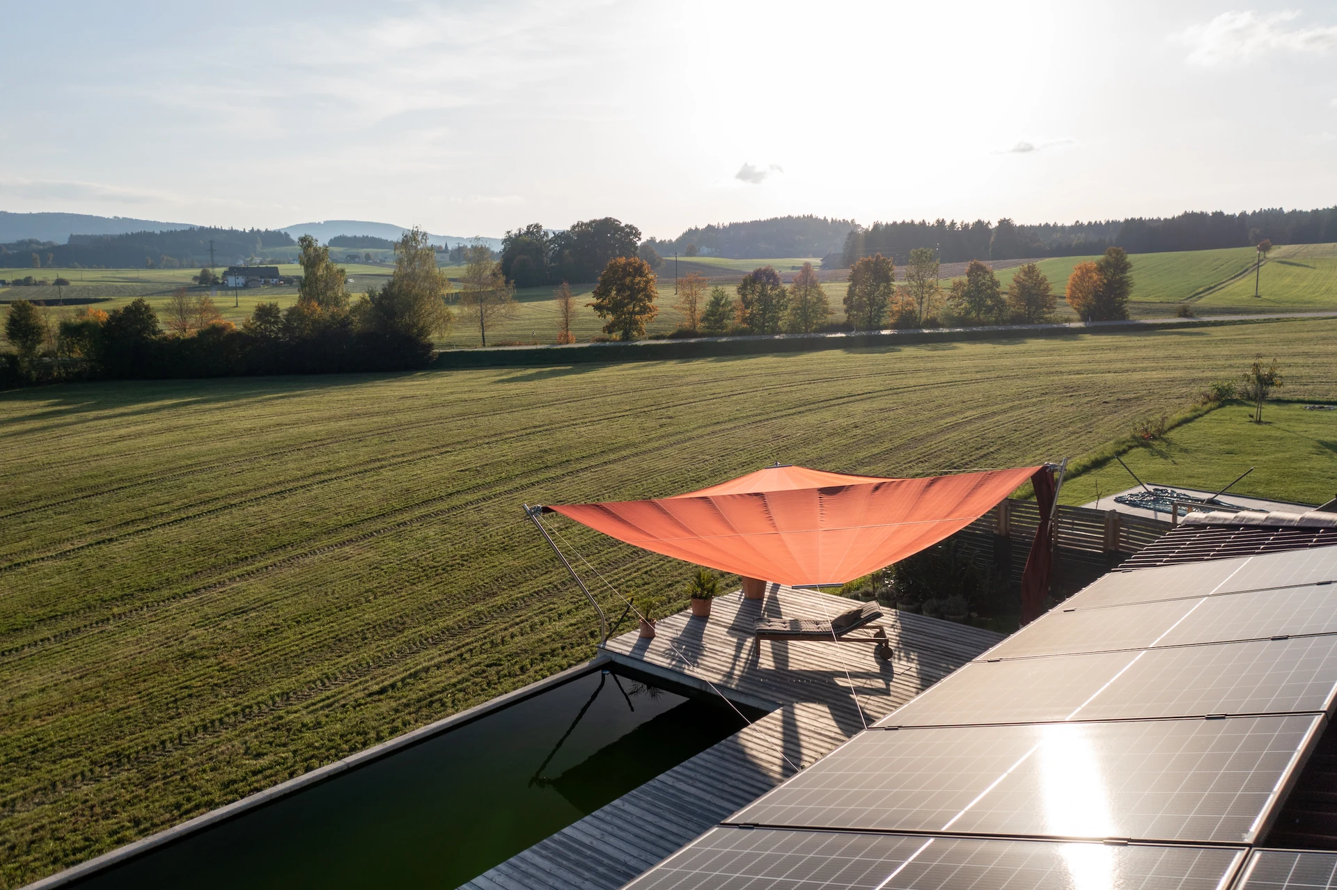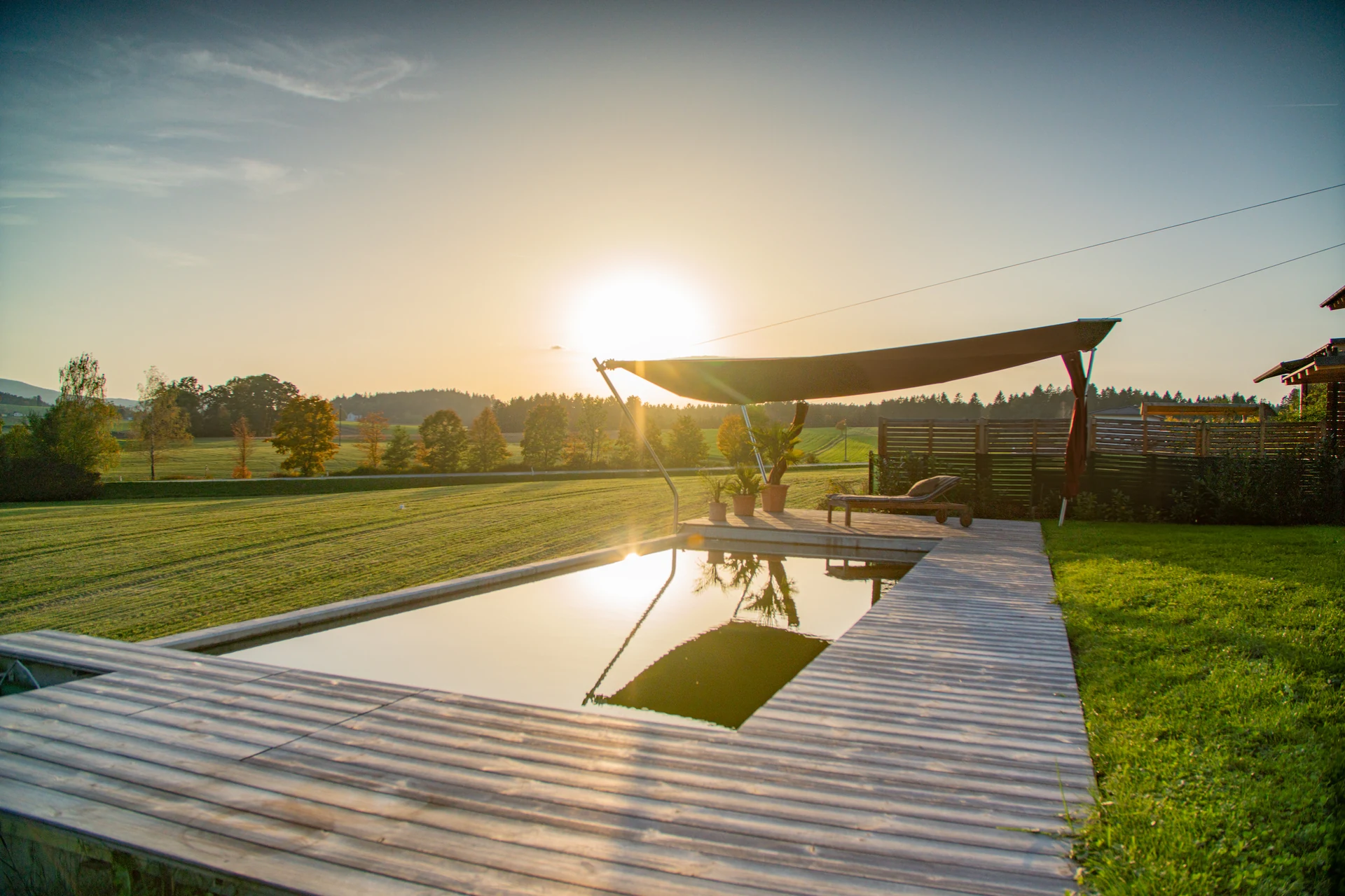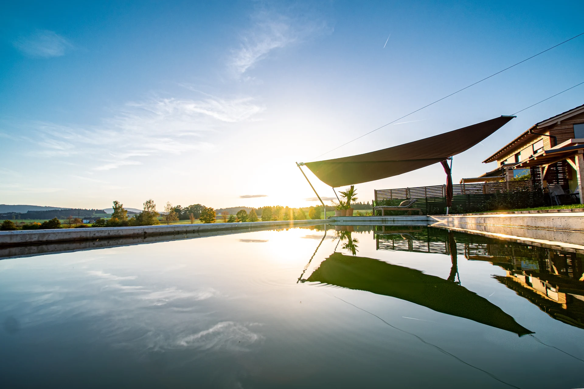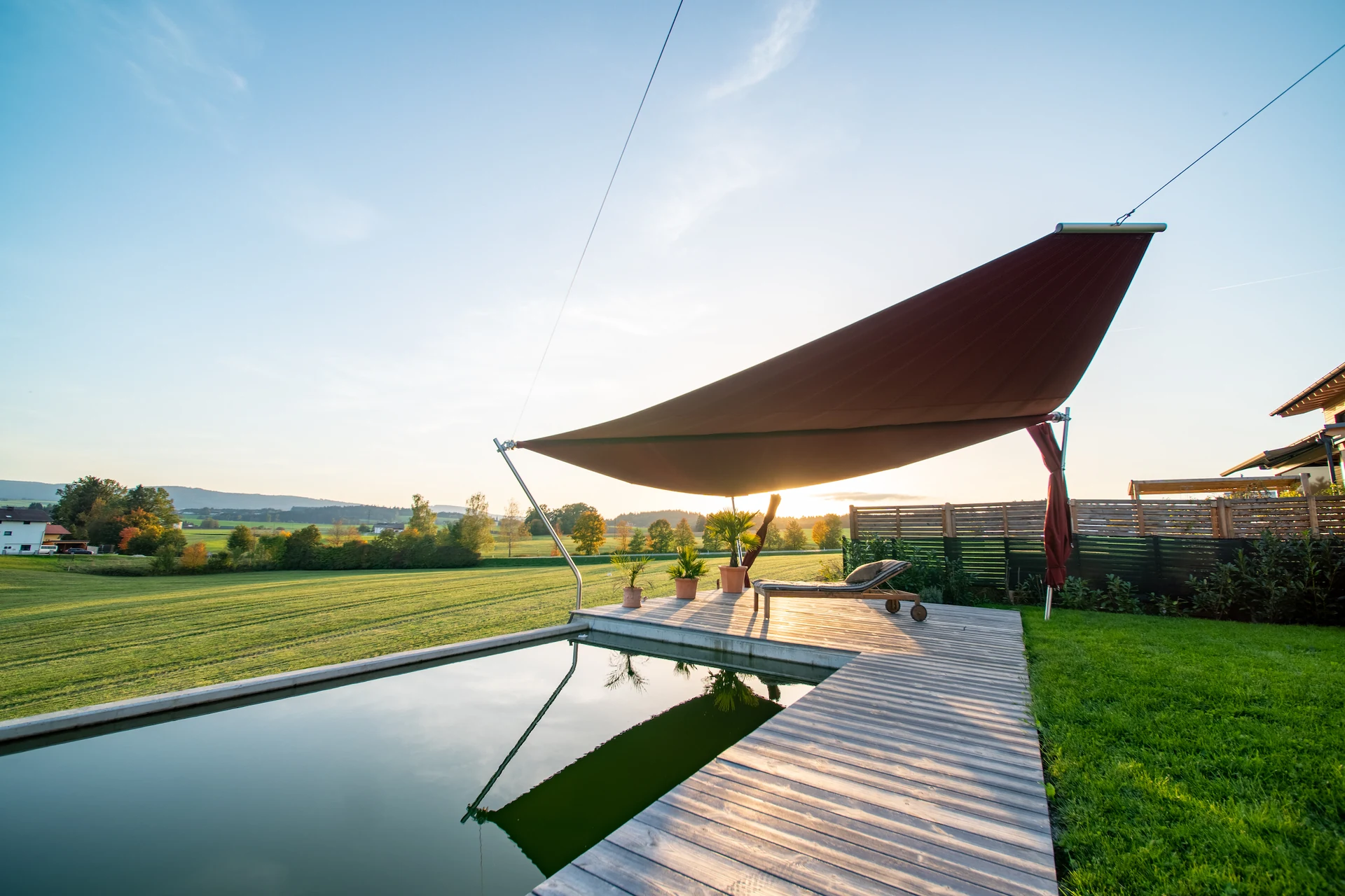 Ein Sonnensegel am Naturpool ist nicht nur funktional, sondern schafft auch einen eleganten Lebensraum im Freien – ideal für Entspannung und produktives Arbeiten bei jedem Wetter.