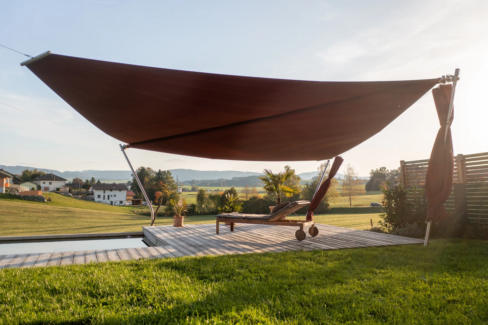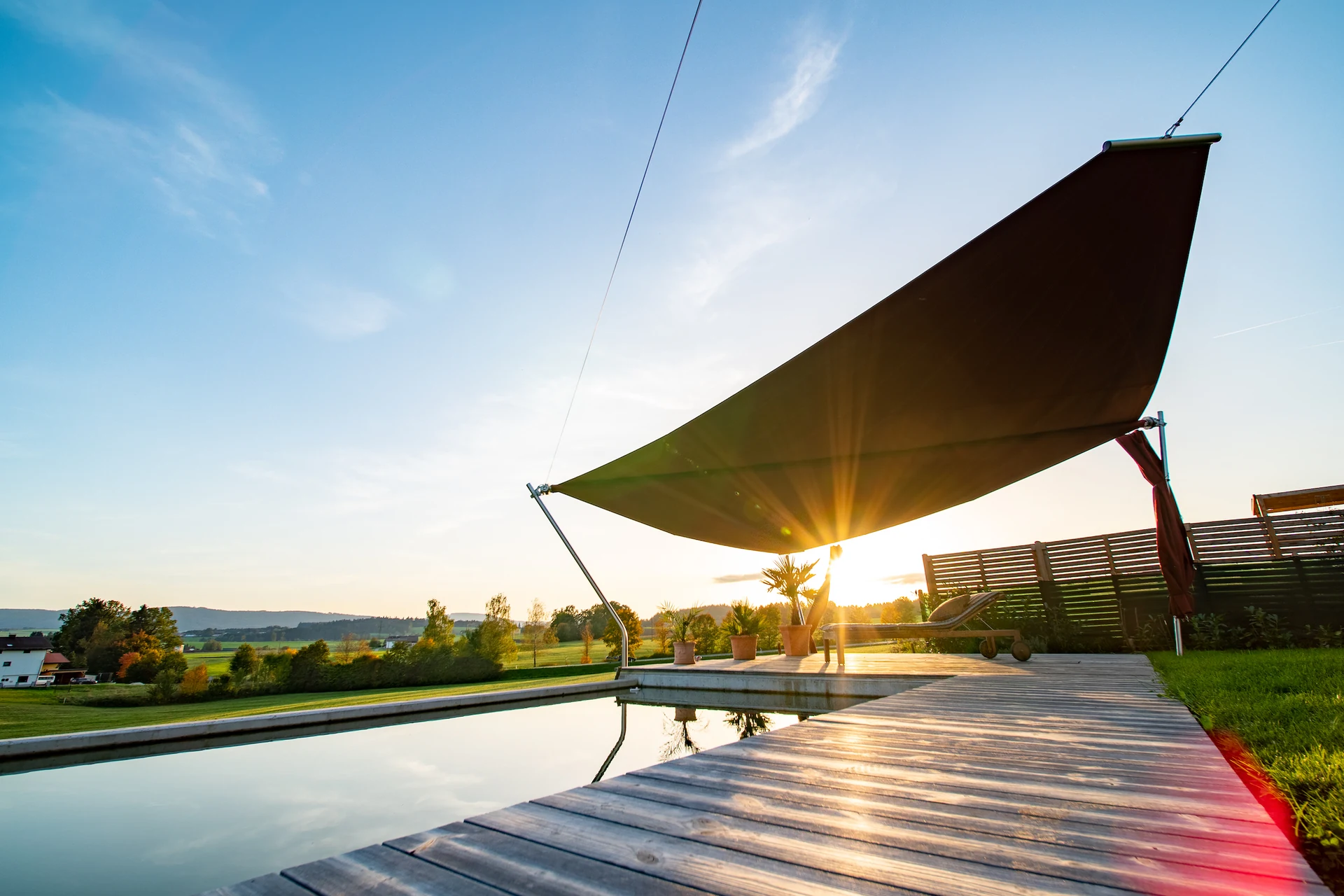Die reduzierte Technik ermöglicht freie Sicht auf Pool und Umgebung, während das straff gespannte Segel zuverlässig vor Sonne, Wind und Regen schützt.