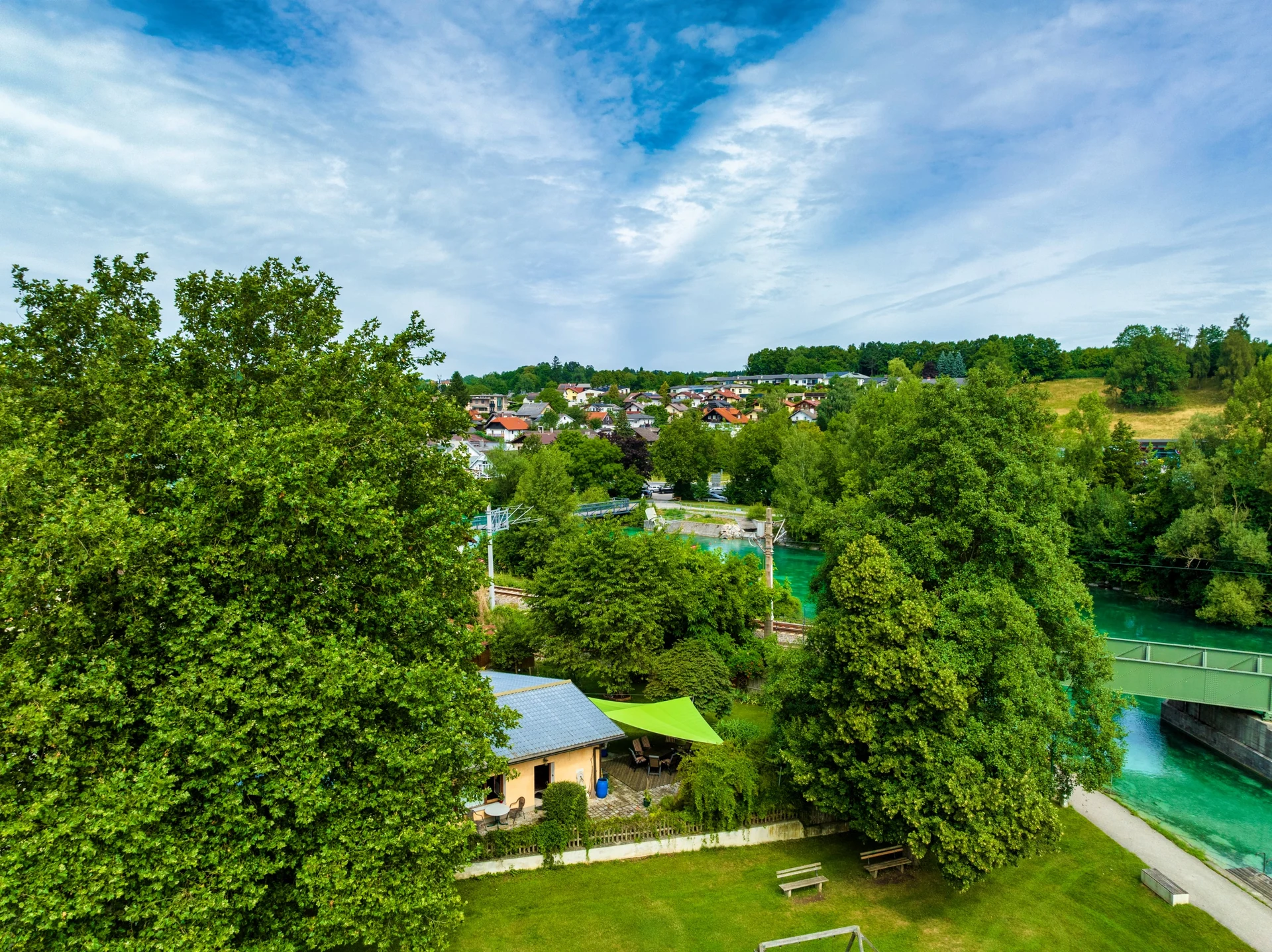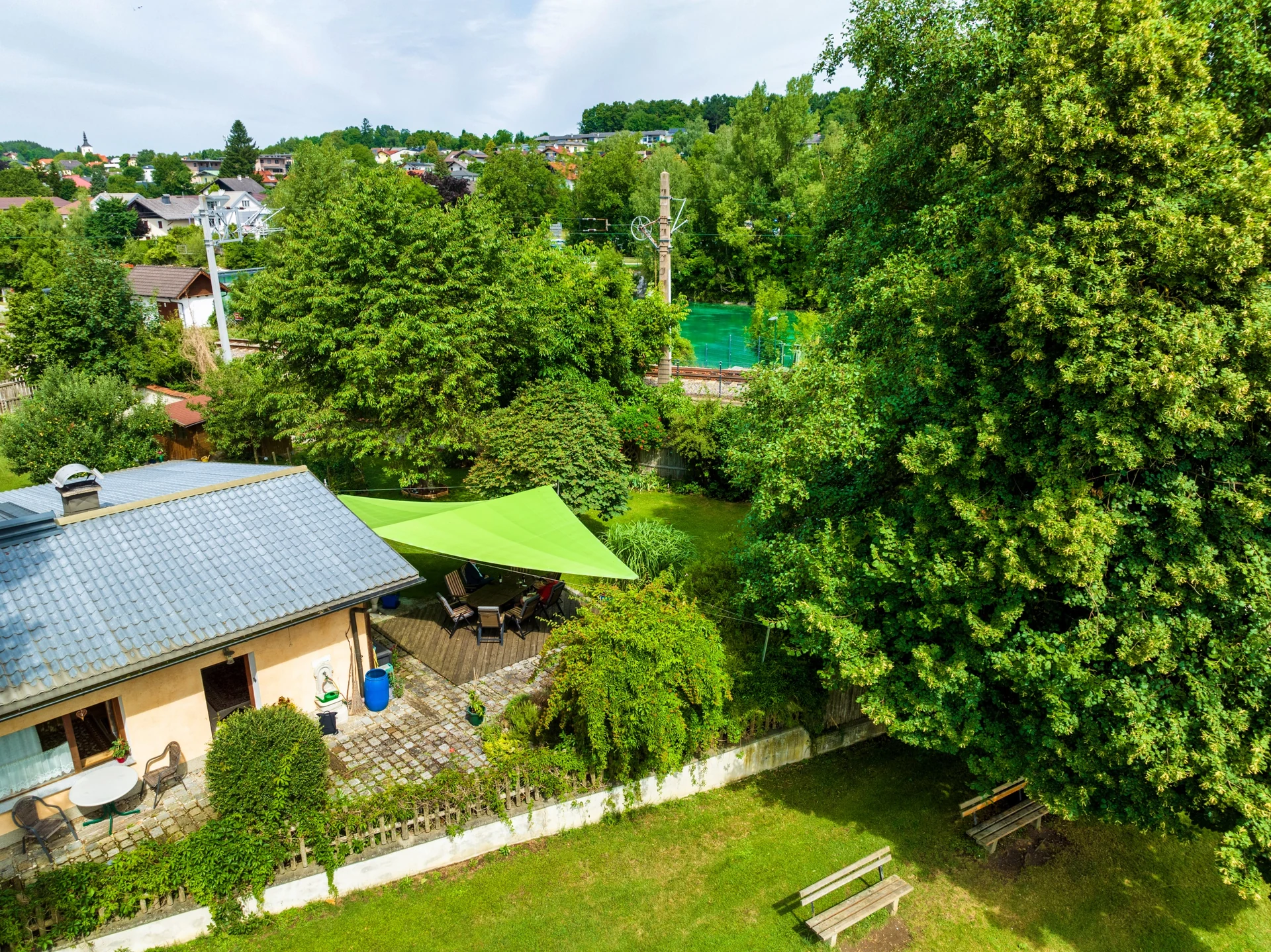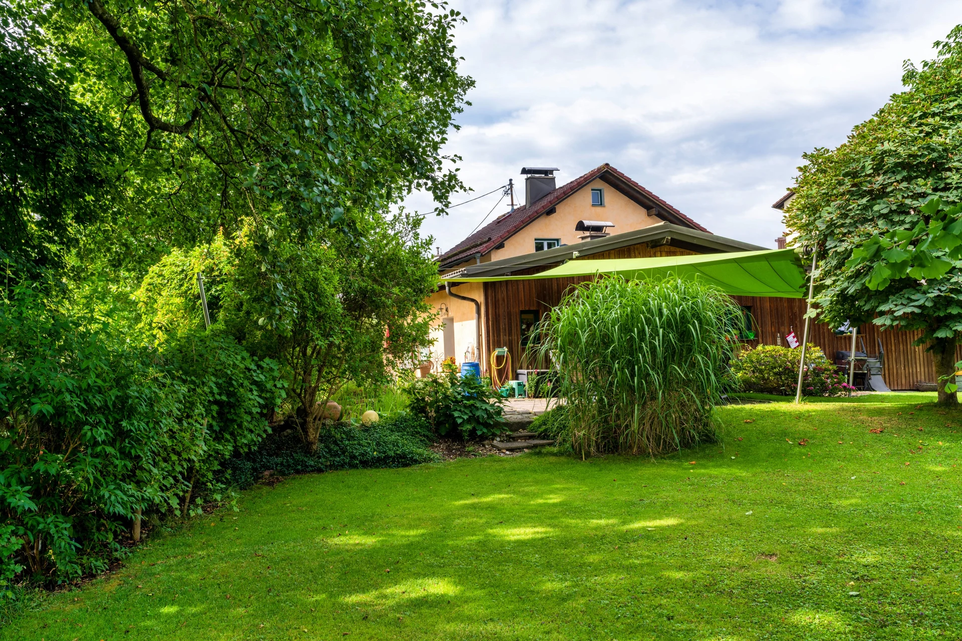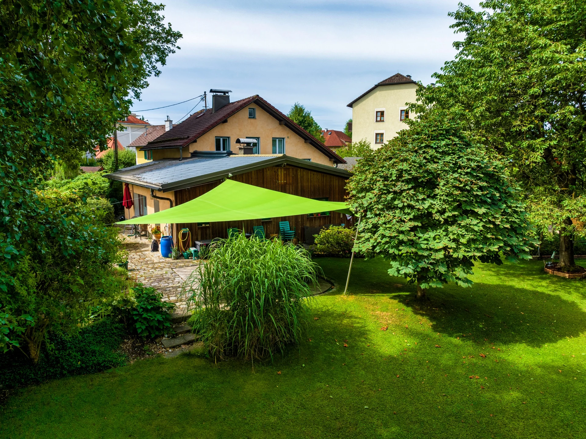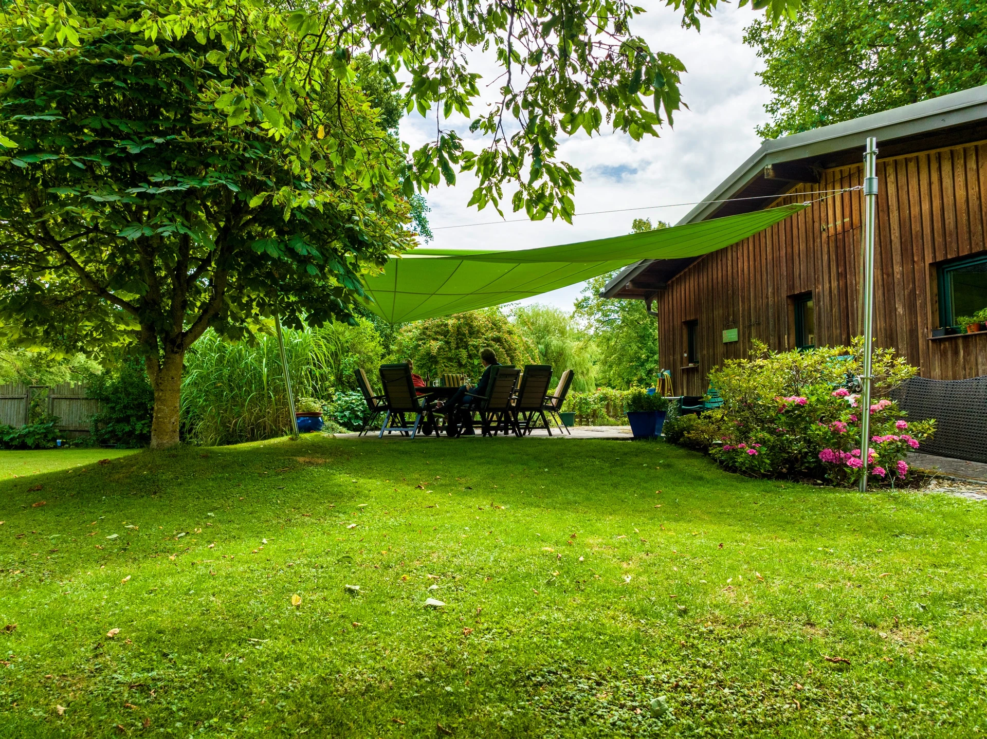 Mit dem grünen, elektrisch steuerbaren Sonnensegel von LET wurde eine flexible Terrassenüberdachung geschaffen, die seit über sieben Jahren täglich im Einsatz ist und dabei durch Ästhetik, Komfort und Qualität überzeugt.
