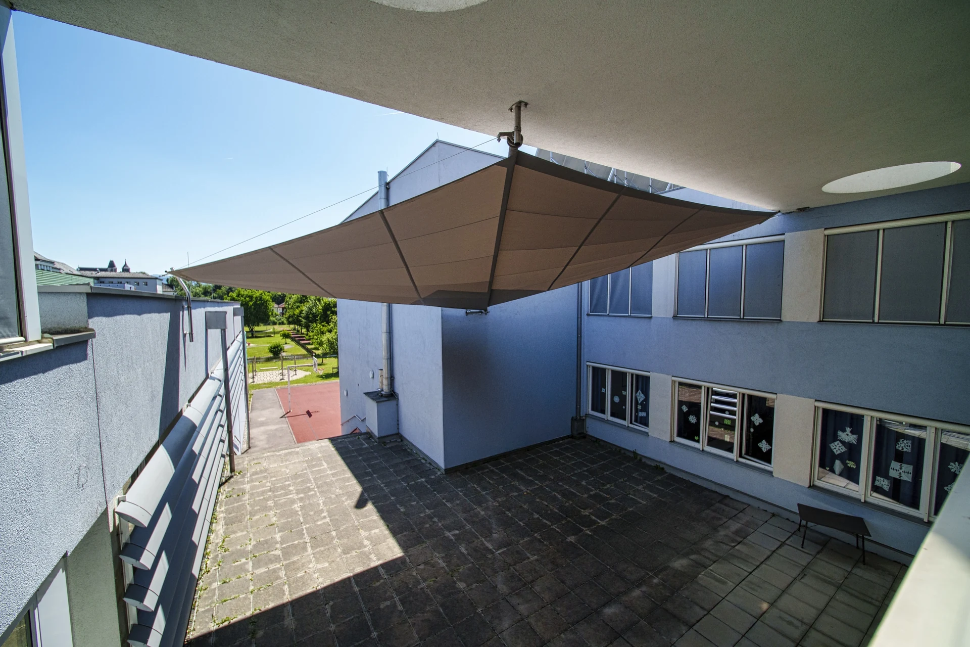 Das Sonnensegel im Schulhof des Privaten ORG Vöcklabruck schafft eine großzügige, stützenfreie Beschattungsfläche – ideal für Pausen, Bewegung und Outdoor-Unterricht. Die freitragende Doppeldreieck-Konstruktion schützt zuverlässig vor Sonne und Regen und schafft ein angenehmes Mikroklima. Robust, wartungsarm und ästhetisch in die Architektur integriert, ist diese Lösung ein Gewinn für Schüler:innen, Lehrpersonal und das gesamte Schulumfeld.