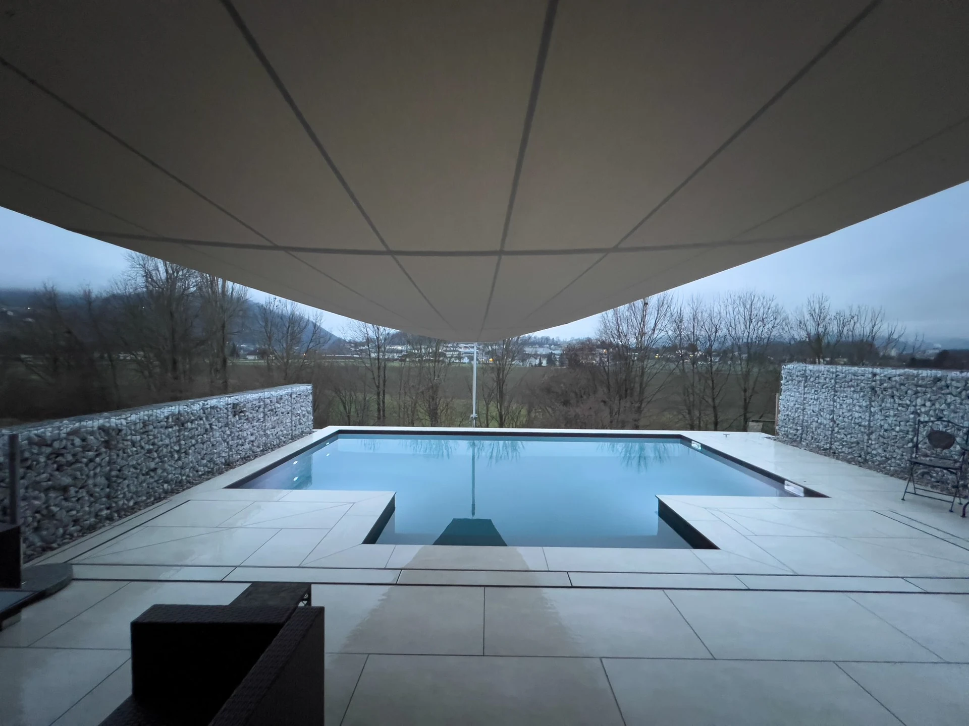 Die exklusive Terrassenüberdachung mit Sonnensegel von LET verbindet minimalistisches Design mit technischer Raffinesse. Die individuell geplanten Segellösungen passen sich architektonisch perfekt an jede Umgebung an und schaffen eine moderne Erweiterung des Wohnraums. Ob als stilvoller Rückzugsort nach Feierabend oder als eleganter Rahmen für gesellige Runden – das Segel schützt zuverlässig vor Wetter und schafft eine wohnliche Atmosphäre im Freien. Besonders praktisch: Die smarte Steuerung reagiert automatisch auf Sonne, Wind oder Regen und lässt sich auf Wunsch ins Smart Home integrieren.