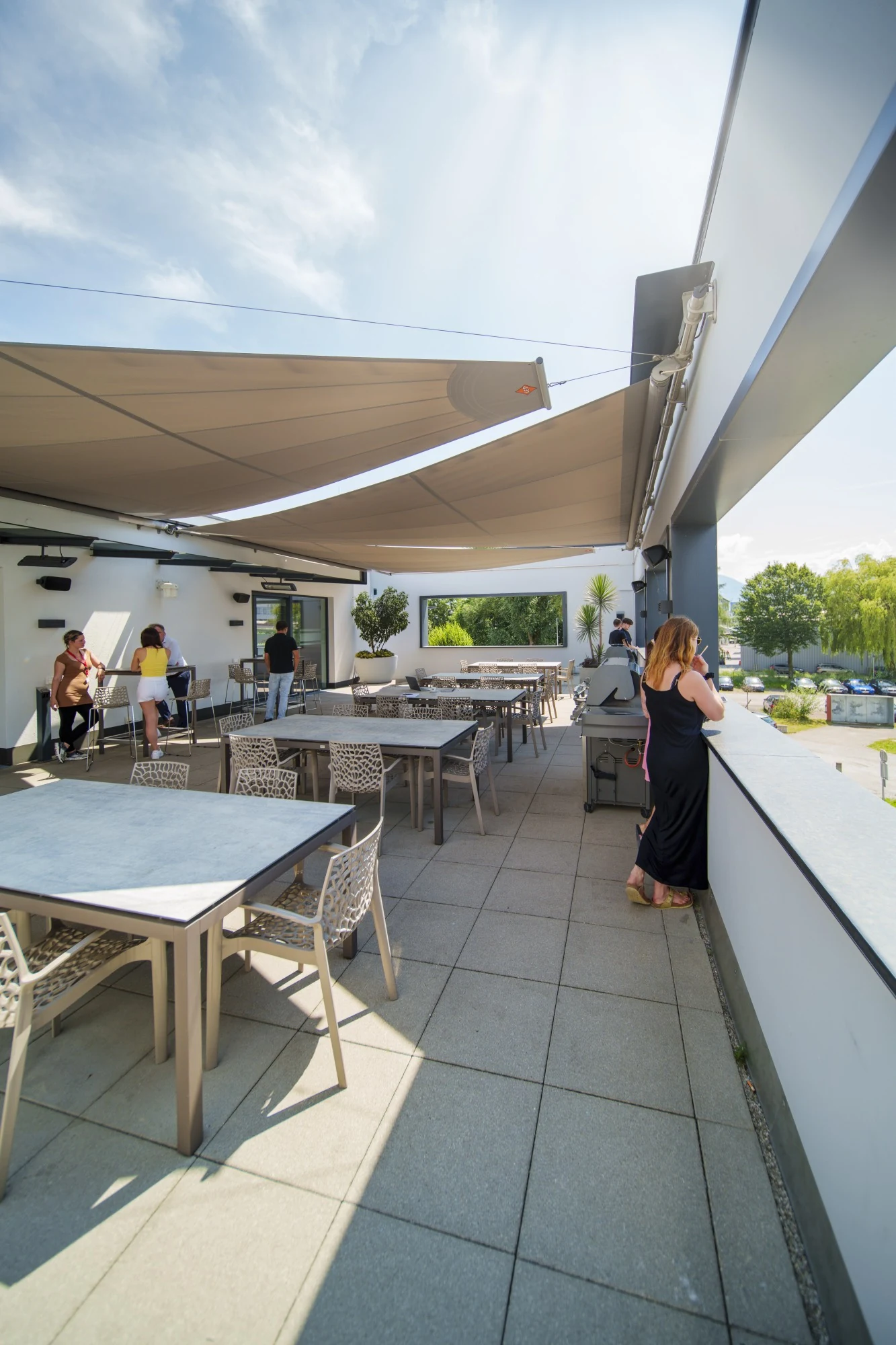 Für die großzügige Unternehmens-Terrasse der ACP Salzburg wurde eine innovative Lösung realisiert: drei einzeln steuerbare Sonnensegel von LET. Die elegante Terrassenbeschattung schützt zuverlässig vor Sonne, Wind und Regen – und lässt sich bequem über die interne Haussteuerung oder App bedienen. Besonders praktisch: Ein integrierter Windwächter sorgt für automatisches Einfahren bei Sturm. So entsteht ein flexibler, ganzjährig nutzbarer Outdoor-Bereich für Mitarbeiter und Kundenevents.