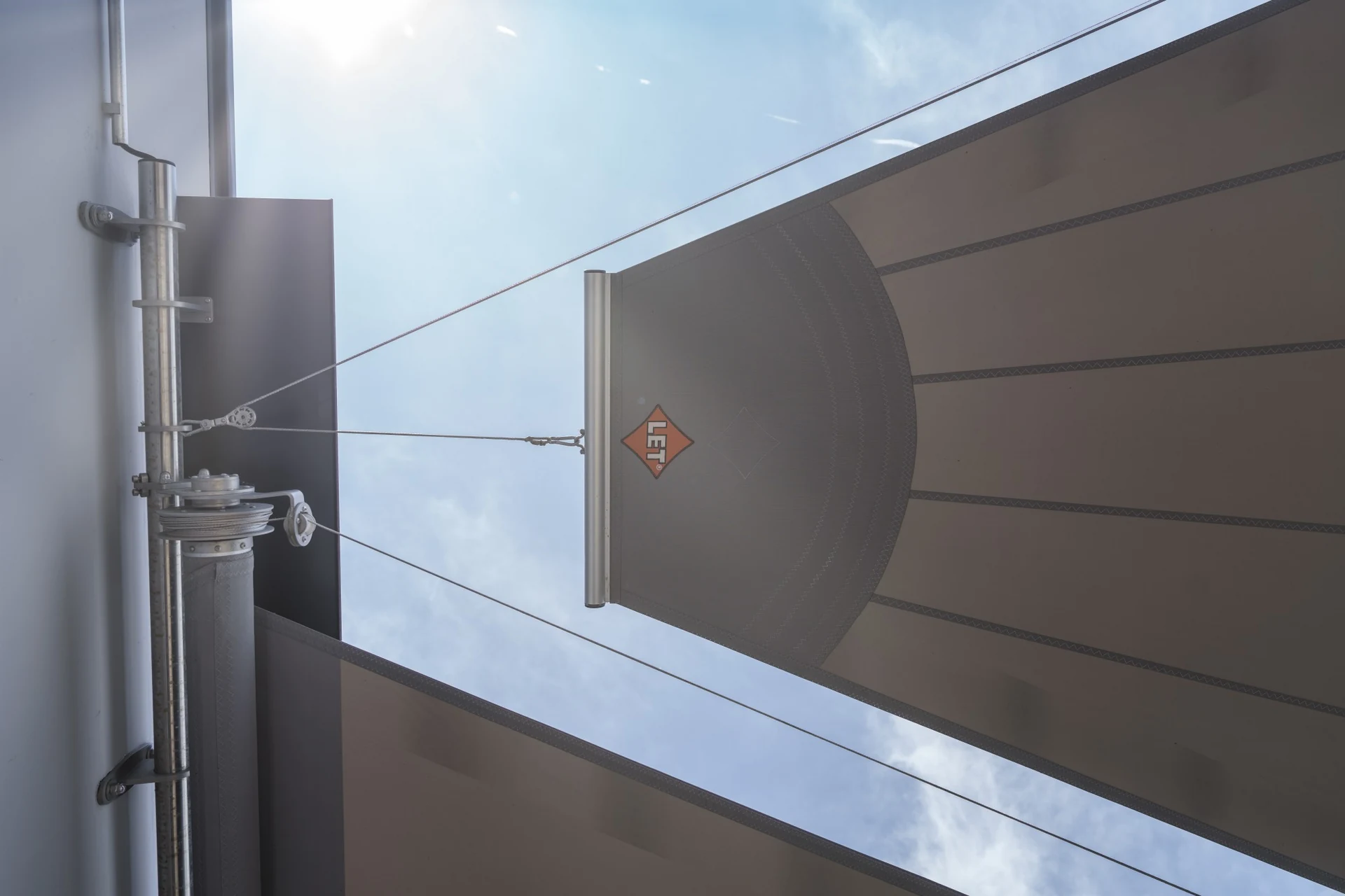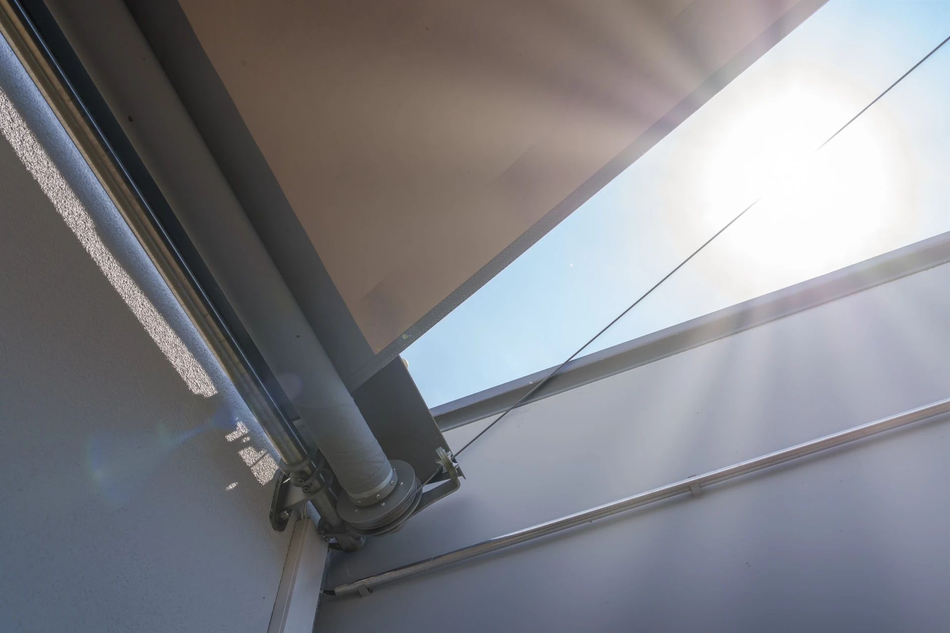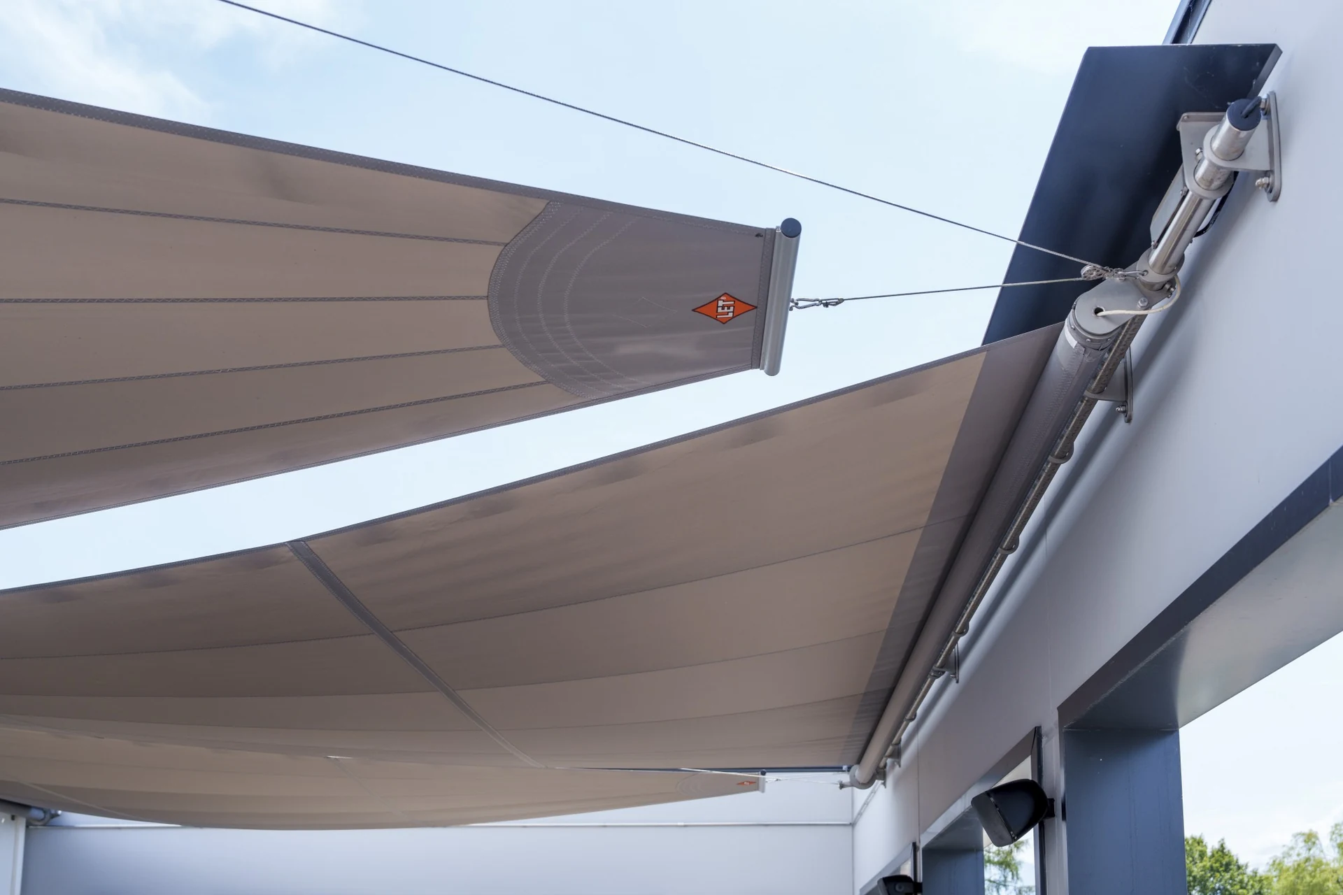 Die innenliegende Montage mit elegantem Wetterschutzdach macht die Segel zu einem unaufdringlichen Bestandteil des Gebäudes und erhält die klare Formensprache.
