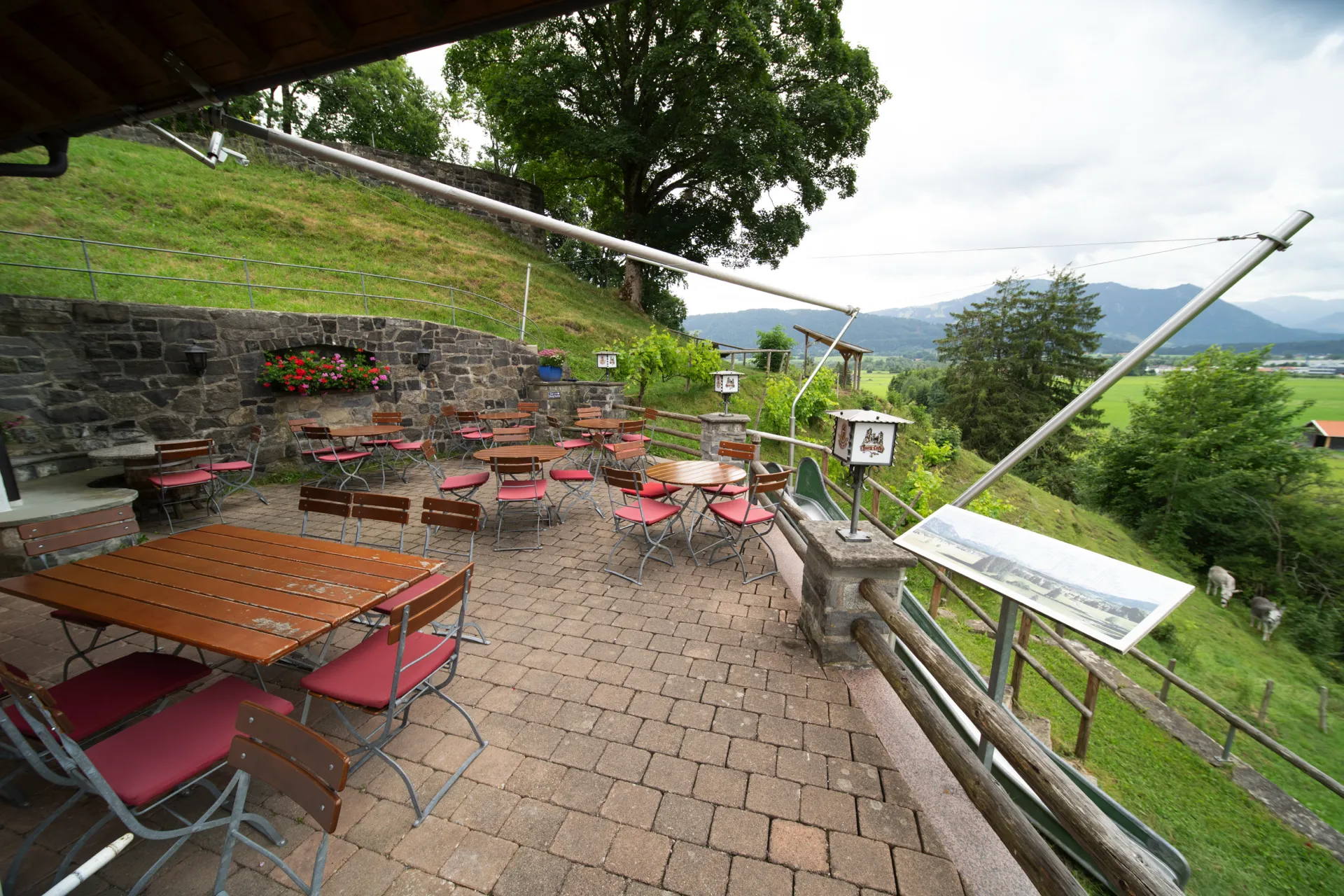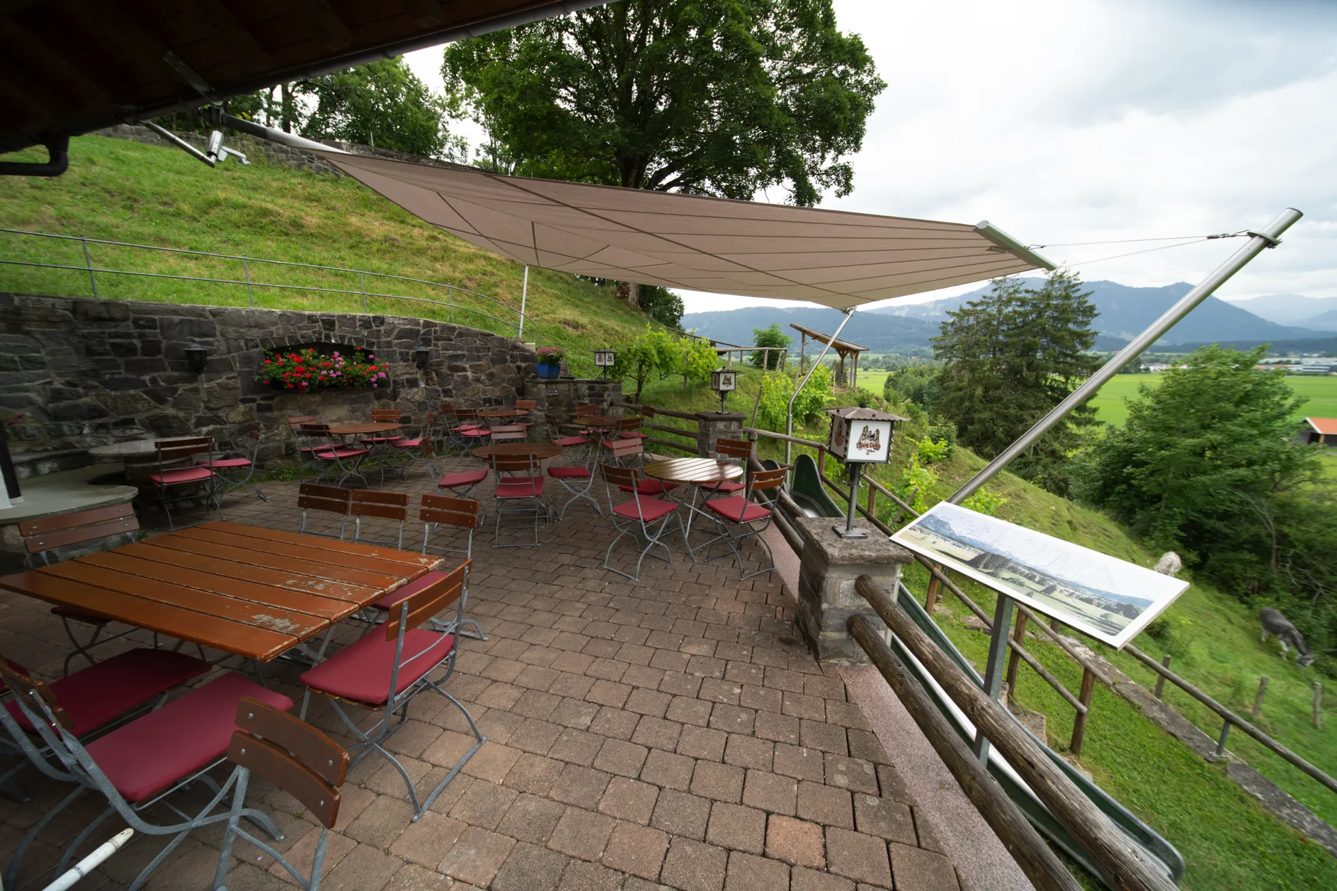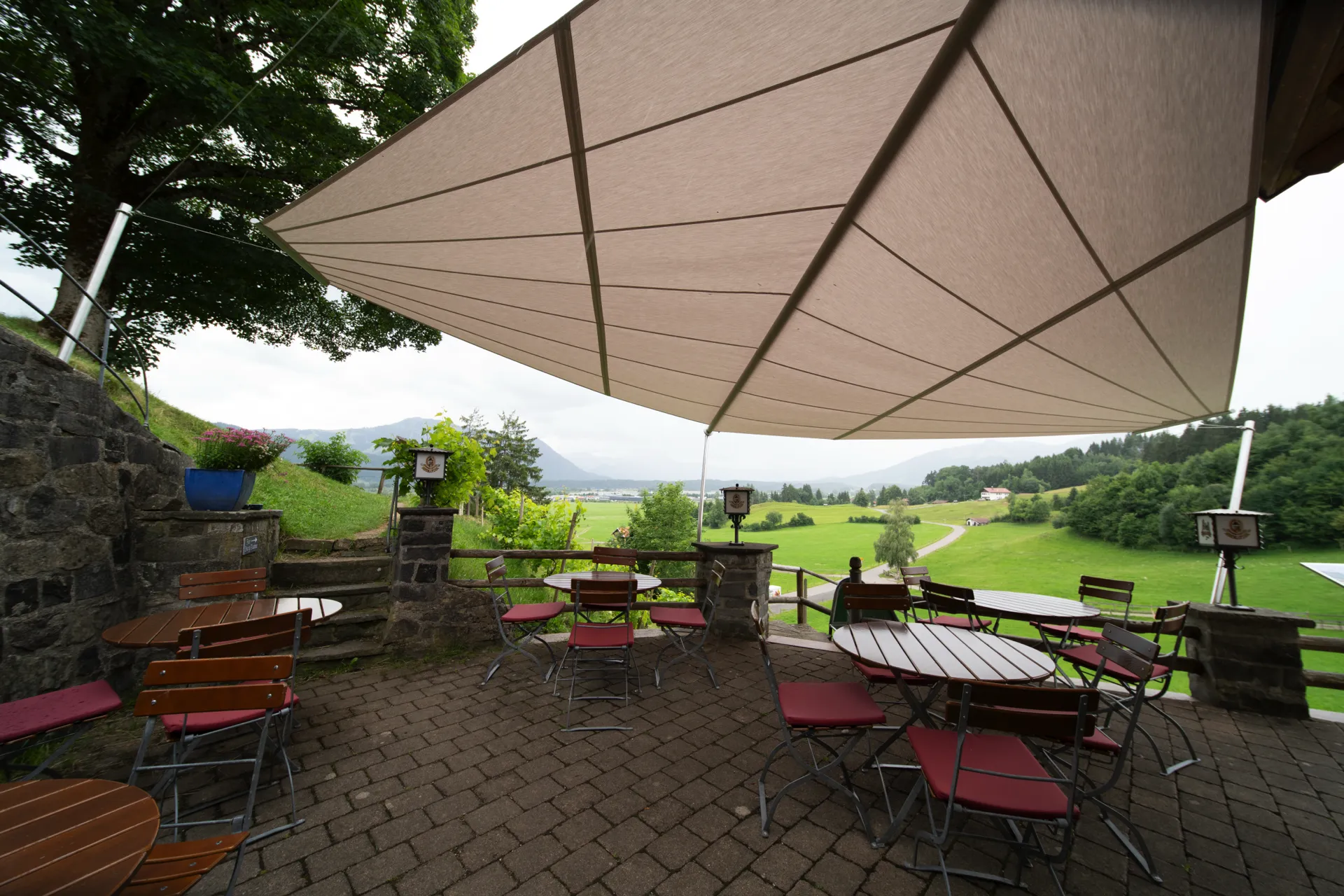 Mit Blick auf die beeindruckende Kulisse der Allgäuer Alpen schafft die maßgeschneiderte Terrassenbeschattung im Burg-Café Werdenstein einen geschützten und stilvollen Außenbereich für Gäste, die Genuss und Natur gleichermaßen erleben möchten.
