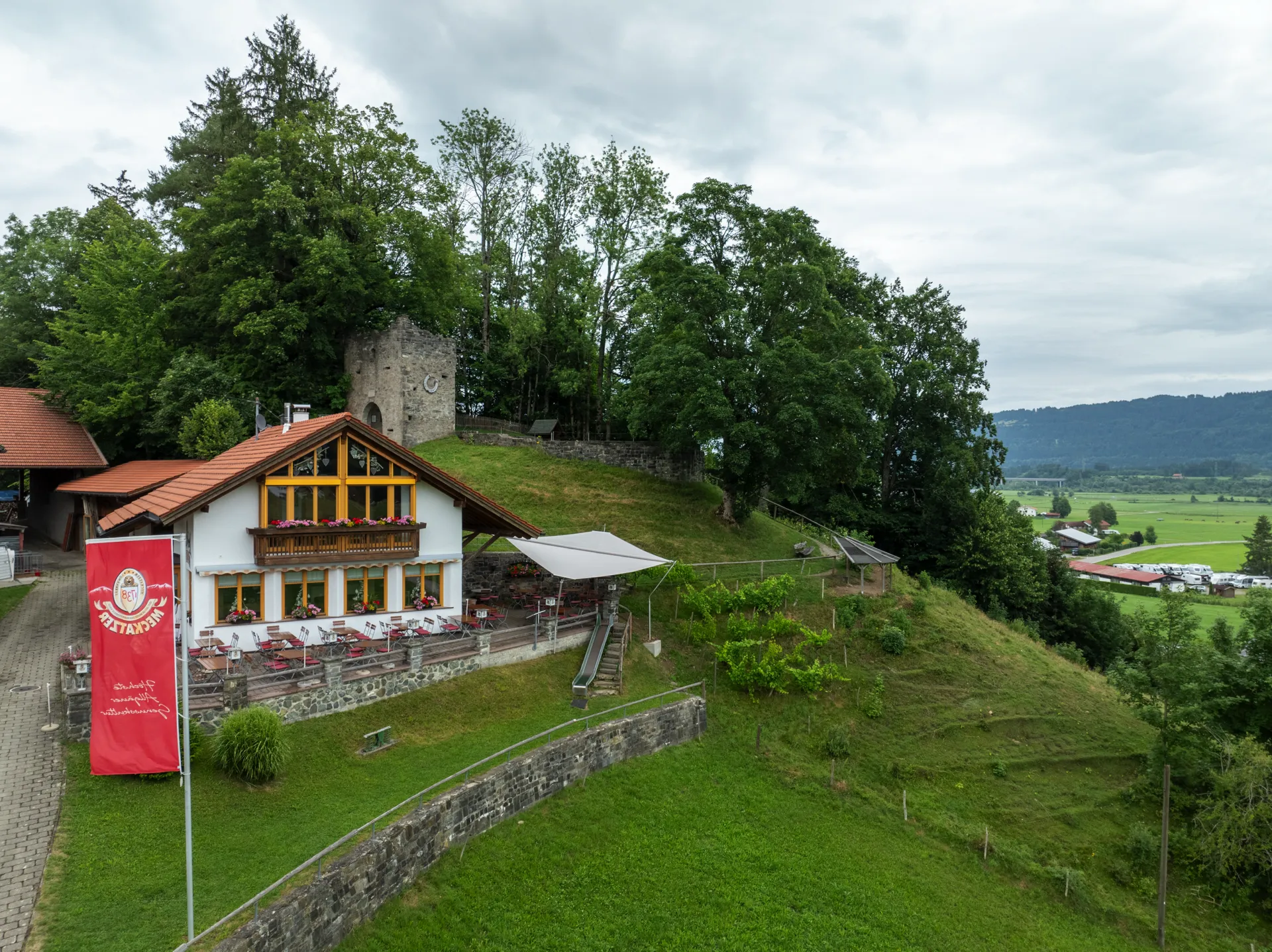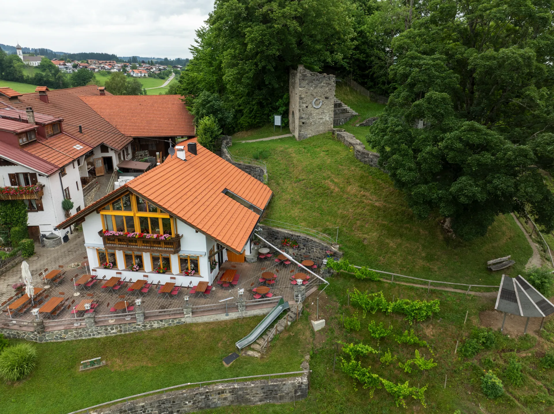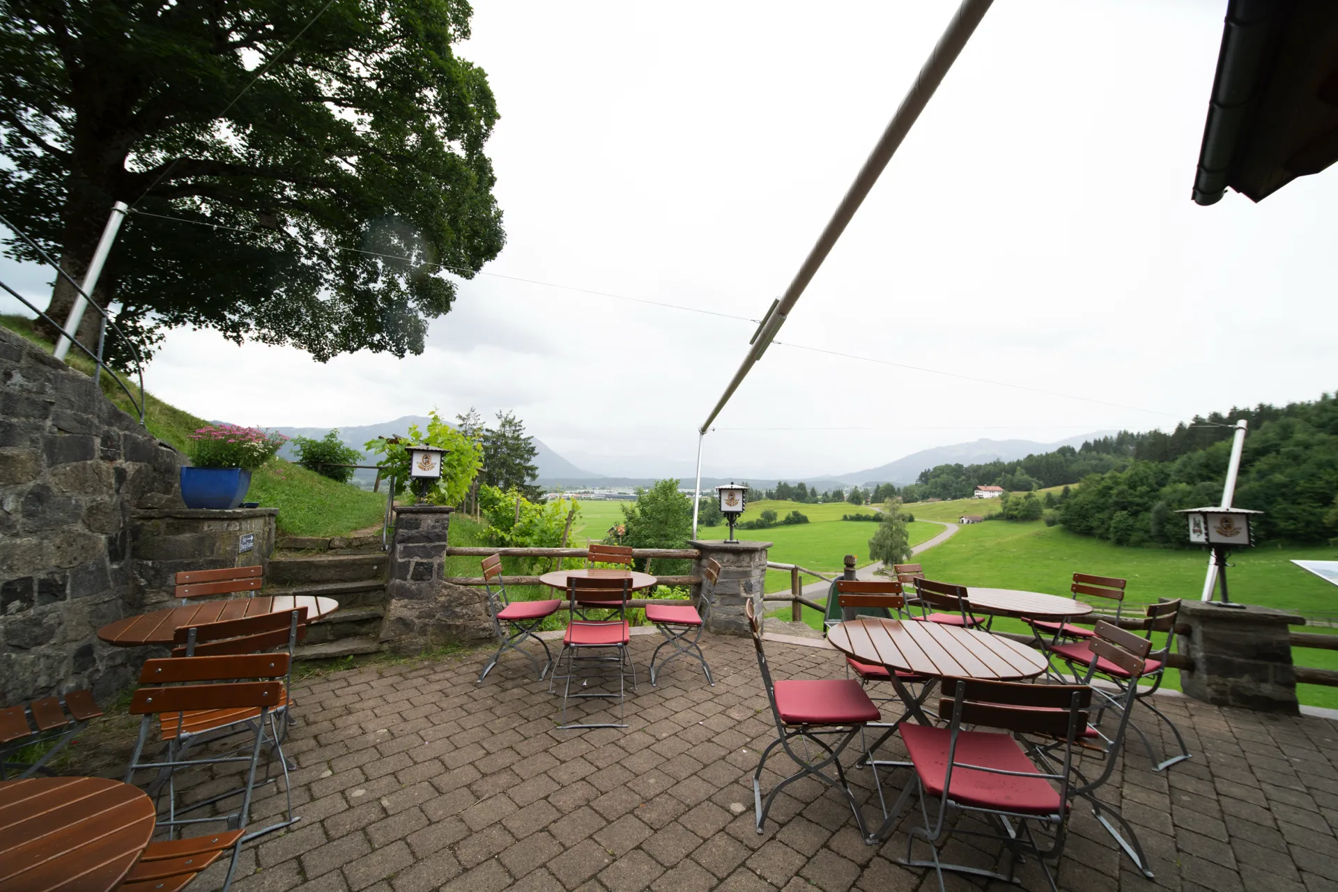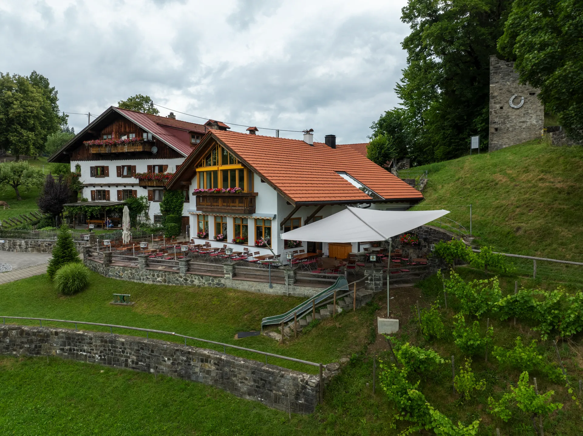 Mit Blick auf die beeindruckende Kulisse der Allgäuer Alpen schafft die maßgeschneiderte Terrassenbeschattung im Burg-Café Werdenstein einen geschützten und stilvollen Außenbereich für Gäste, die Genuss und Natur gleichermaßen erleben möchten.
