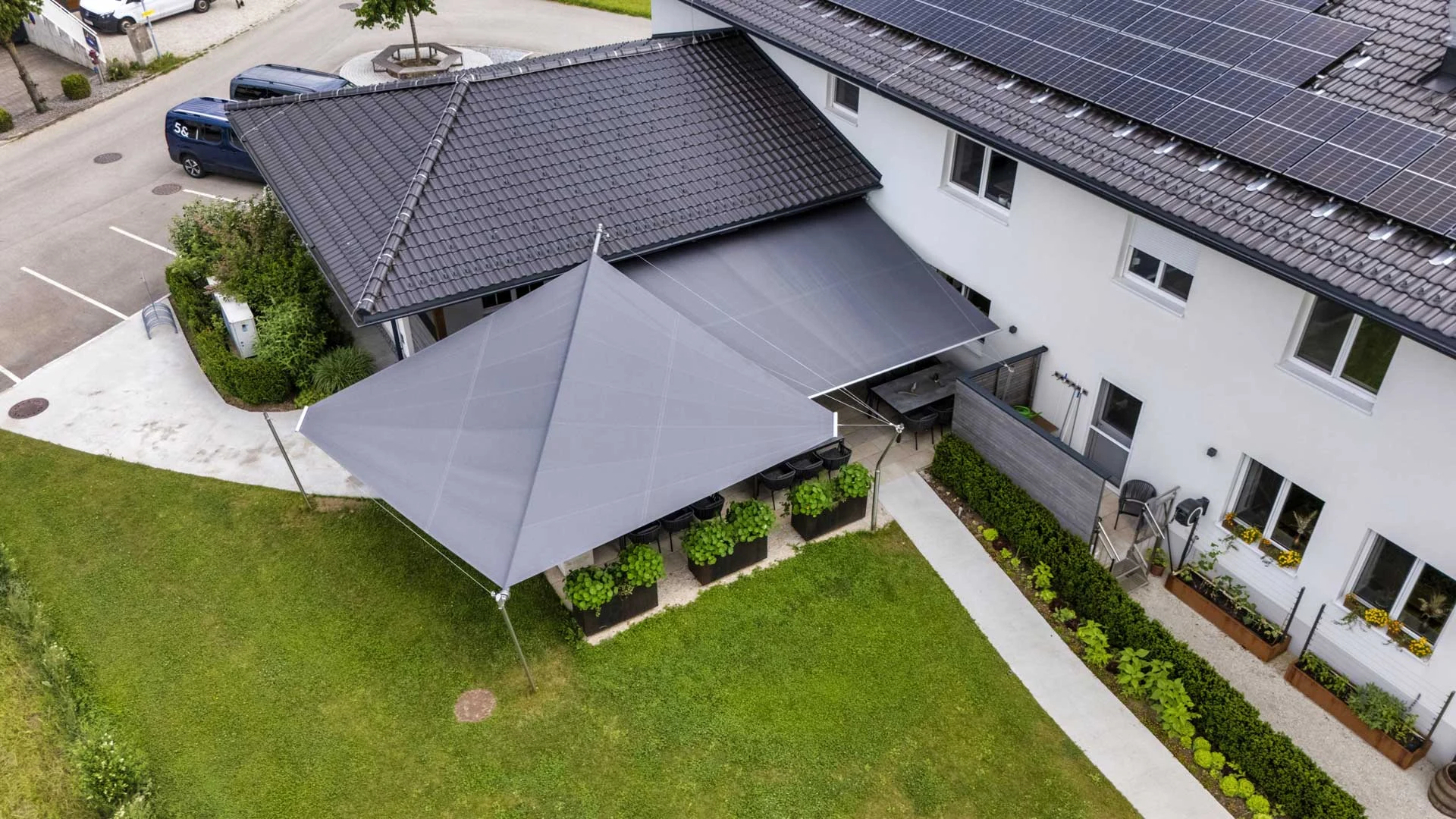Die klare Linienführung der Trapez- und Doppeldreiecksegel fügt sich nahtlos in die Architektur des Gastgartens ein.